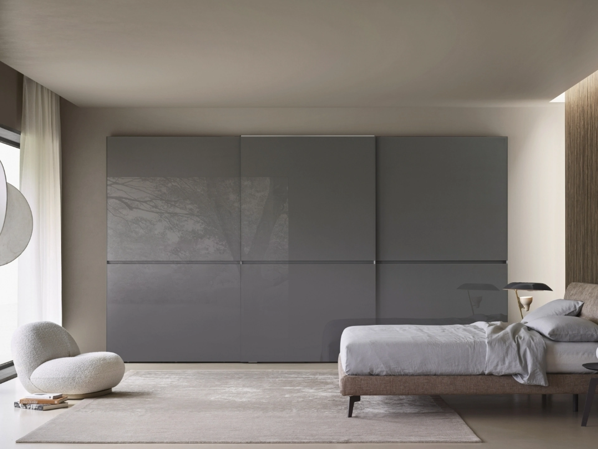 Gli Armadi a muro con ante scorrevoli sono componenti essenziali nella zona notte, per renderla ben arredata, pratica e completa di tutto. Per allestire ottimamente una stanza bella e di grande qualità, prediligi le più originali soluzioni dei migliori produttori, letti, armadi e comò di alto contenuto estetico. Contattaci e ottieni informazioni sulla nostra linea di Arredamento Casa: potrai completare la camera da letto grazie a una ampia offerta di mobili contenitori design, come l'armadio in vetro nell'immagine.
