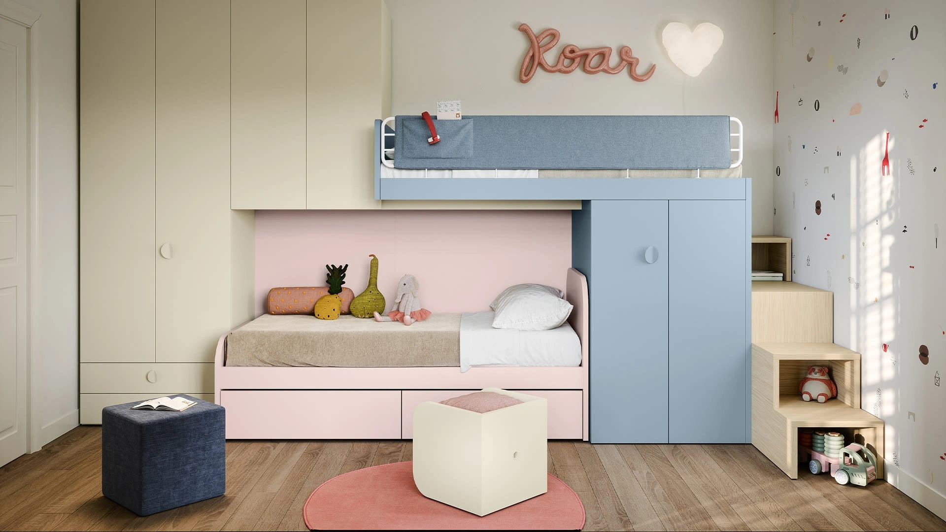 Nell'arredamento della stanza dei piccoli affidati a noi: nel nostro showroom presentiamo tutte le più originali composizioni arredative moderne per la loro camera. Porta estetica e tonalità vivaci nella stanza dedicata ai più giovani con questa proposta, una tra le Camerette a soppalco per bambine di Nidi. Questa proposta in melaminico ultima ottimamente le doti pratiche e l'estetica della camaretta, poiché è capace di abbinare ergonomia e sicurezza. Nidi mette a disposizione un ricco catalogo di elementi accessori da abbinare su misura: troverai letto, guardaroba, tavolo da lavoro, sedie e librerie.