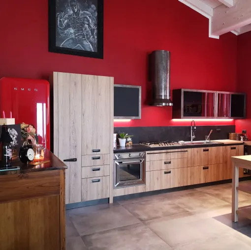 Composizione cucina che combina funzionalità ed estetica in un ambiente moderno dai tratti Industrial.