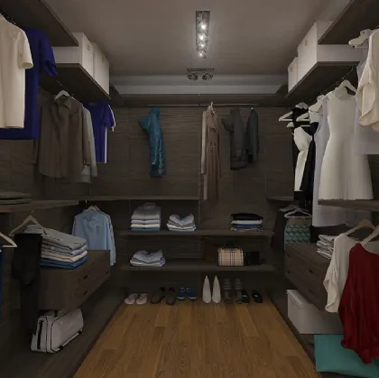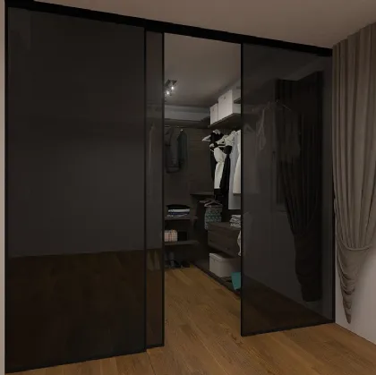 Cabina armadio dalle ante fumè cela al suo interno una composizione di mensole, schienali e cassettiere sospese in legno cenere.