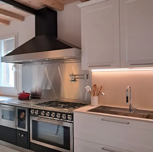 Il modello Meg di Arredo3 dalle ante con telaio Bianco Maxximatt risultava perfetto per l’atmosfera contemporanea, e non troppo moderna, desiderata dai clienti. L’inserimento del frigo side by side e del blocco cottura a legna combinato, hanno reso la cucina ricca di comfort moderni, ma delineati da una linea classica che rispecchiasse il contesto esterno rurale.