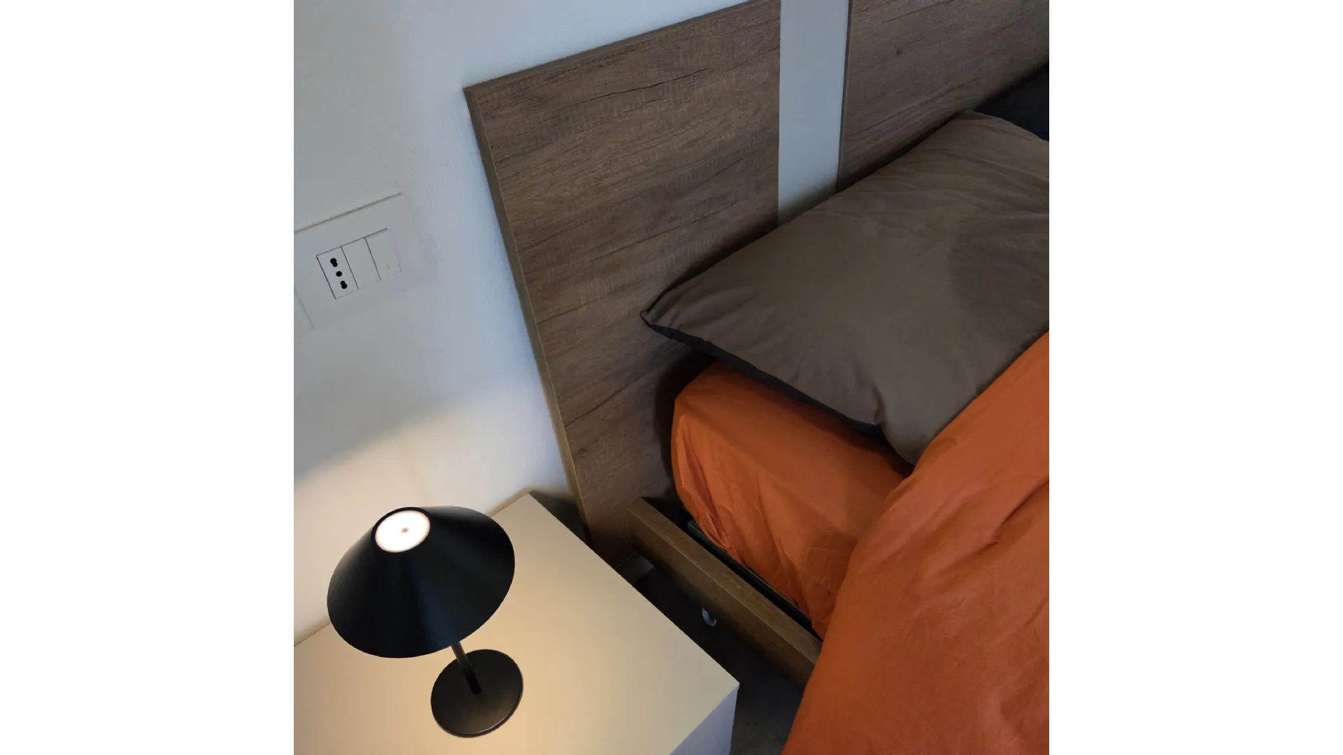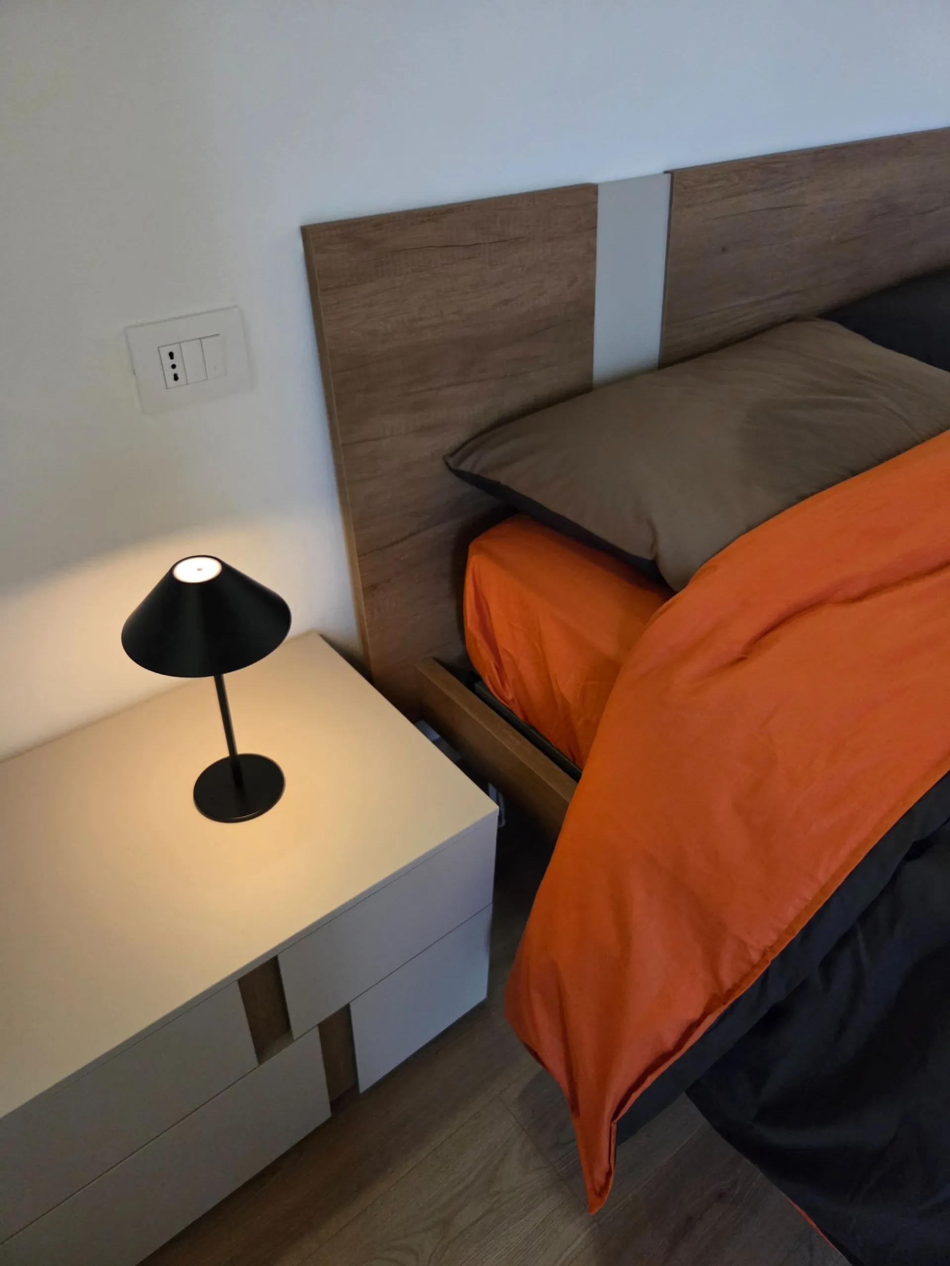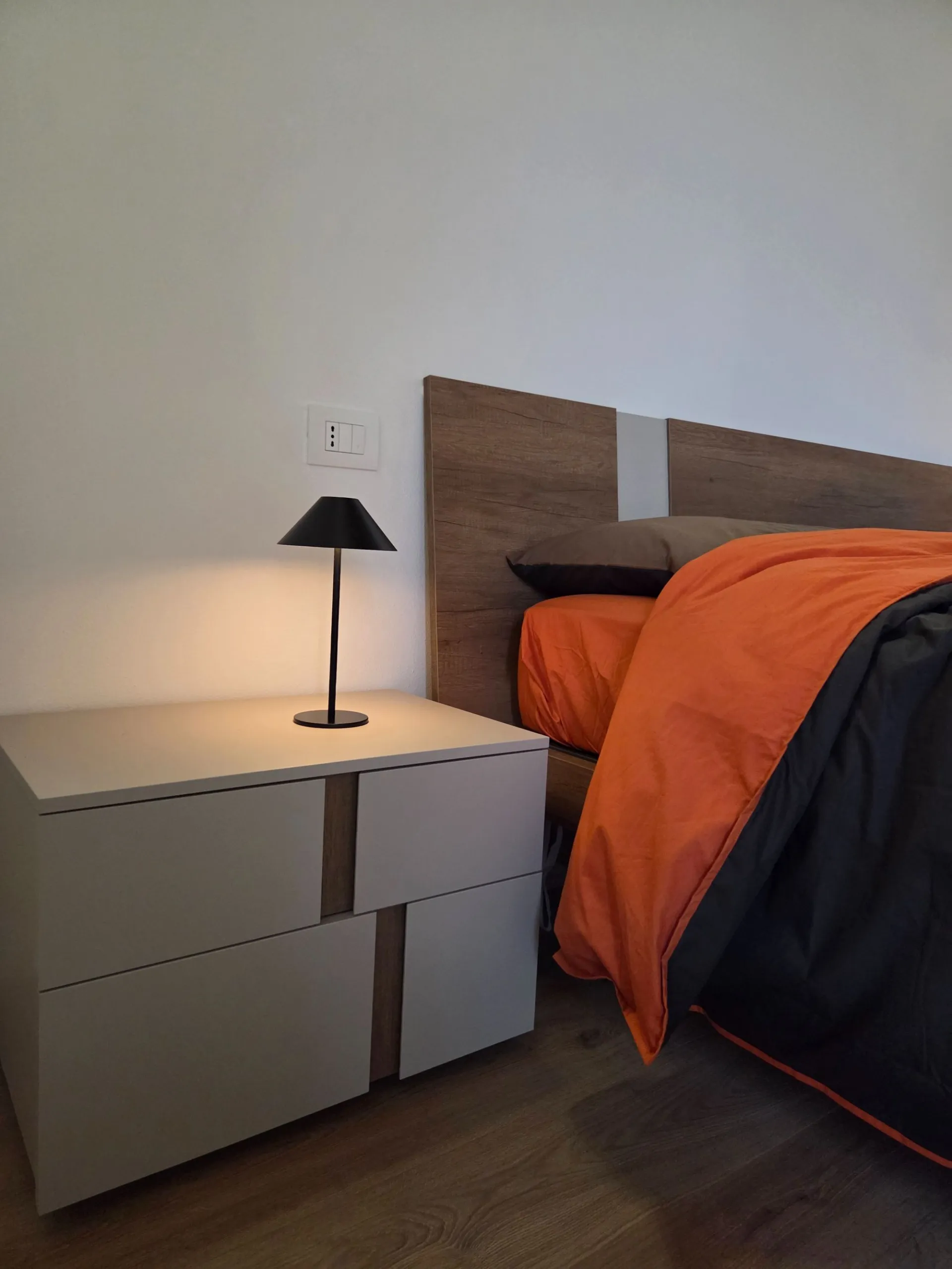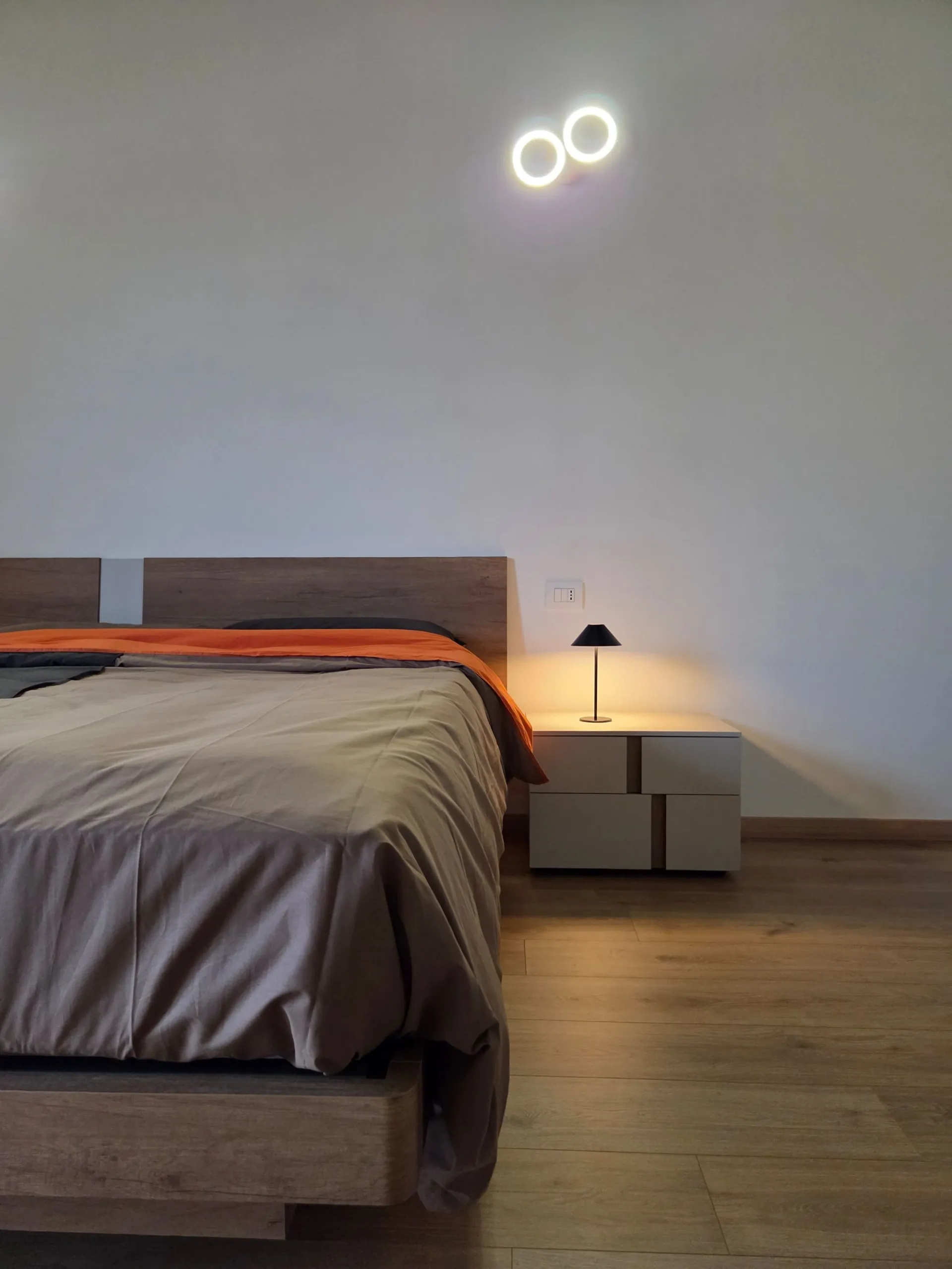 Letto con contenitore e comodini si inseriscono in modo equilibrato, contribuendo a un insieme ordinato e coerente, pensato su misura per questo spazio specifico.