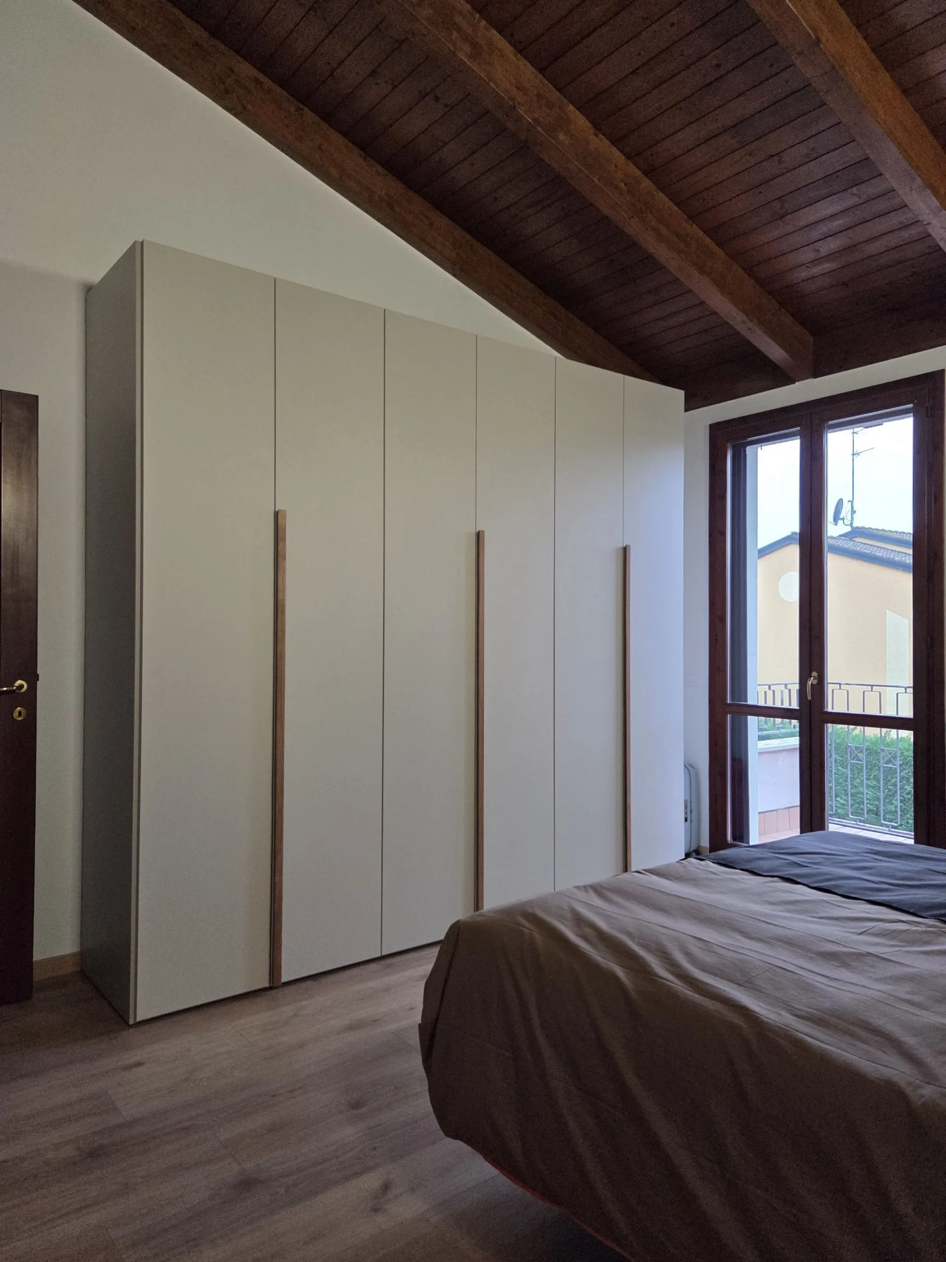Da lì abbiamo costruito una camera matrimoniale capace di dialogare con l’architettura esistente, valorizzando le altezze e l’identità dell’ambiente attraverso finiture madreperla materico e nodato chiaro.