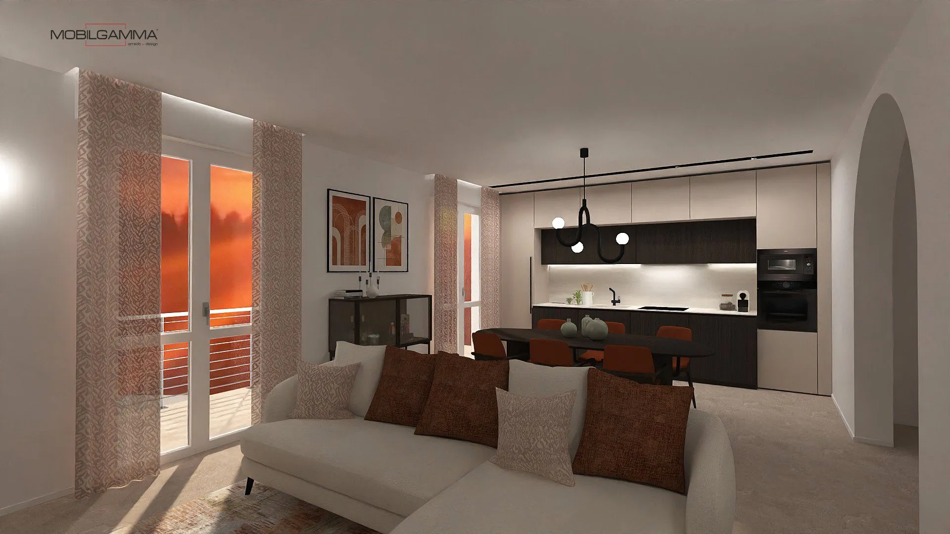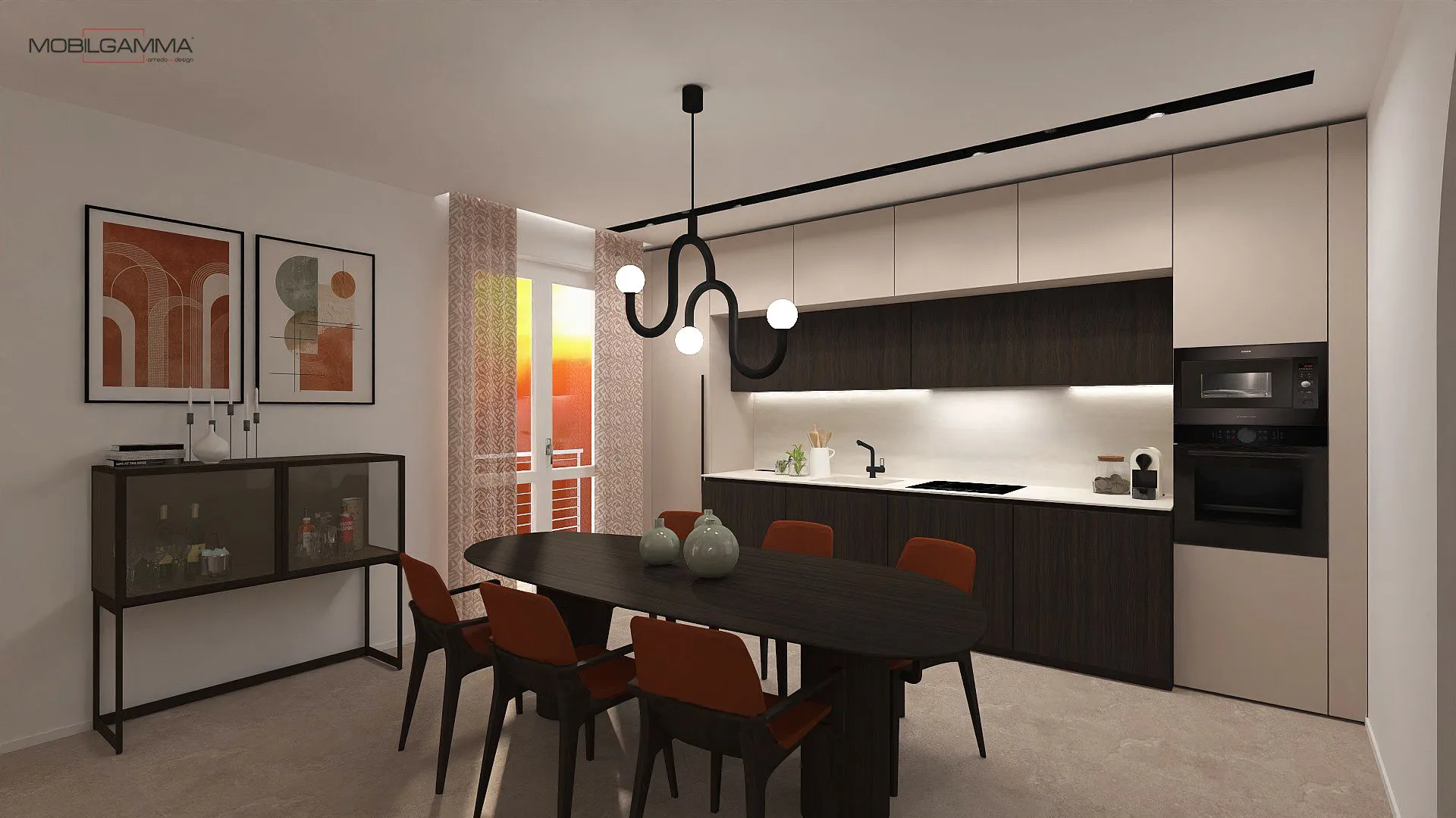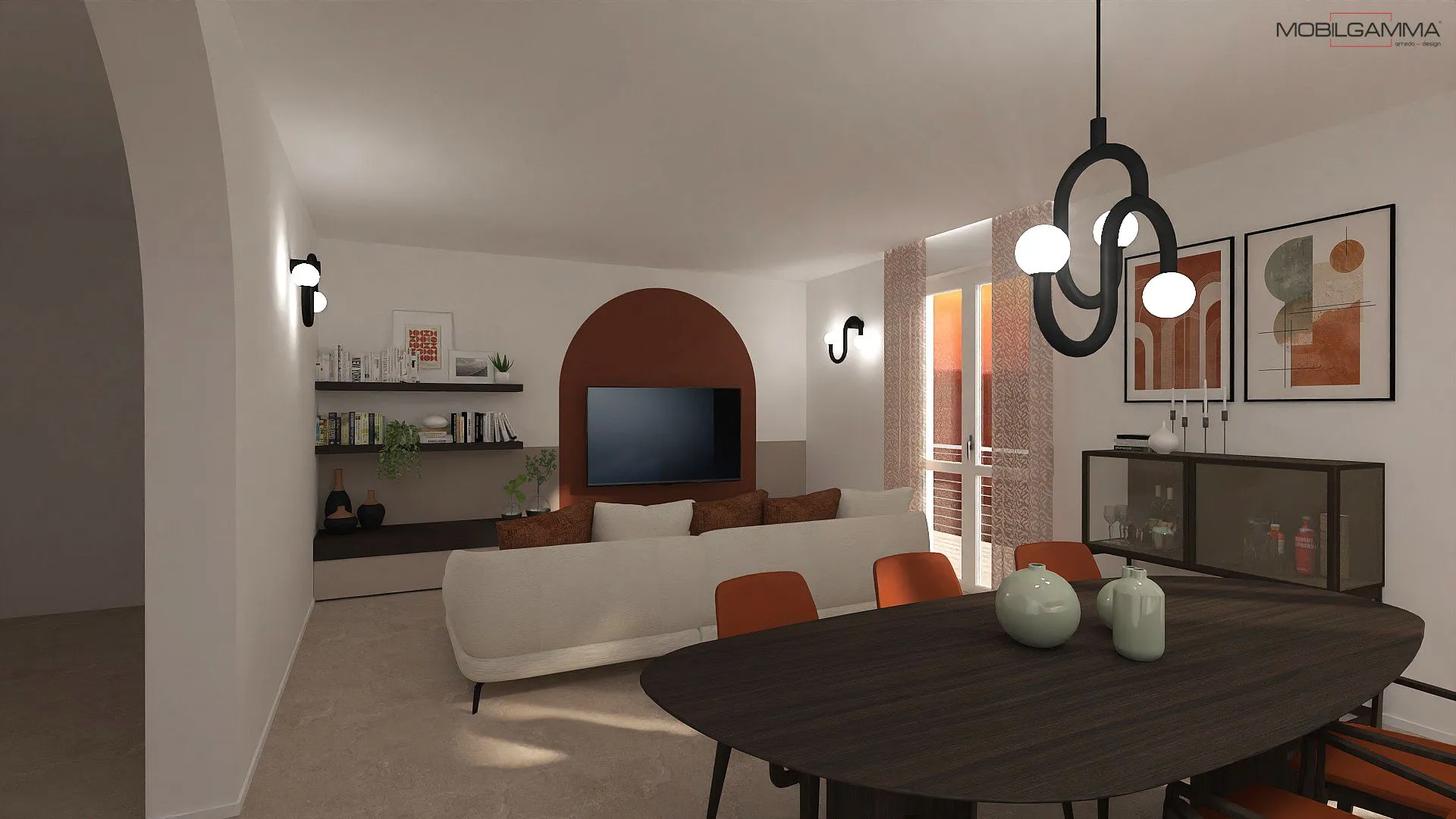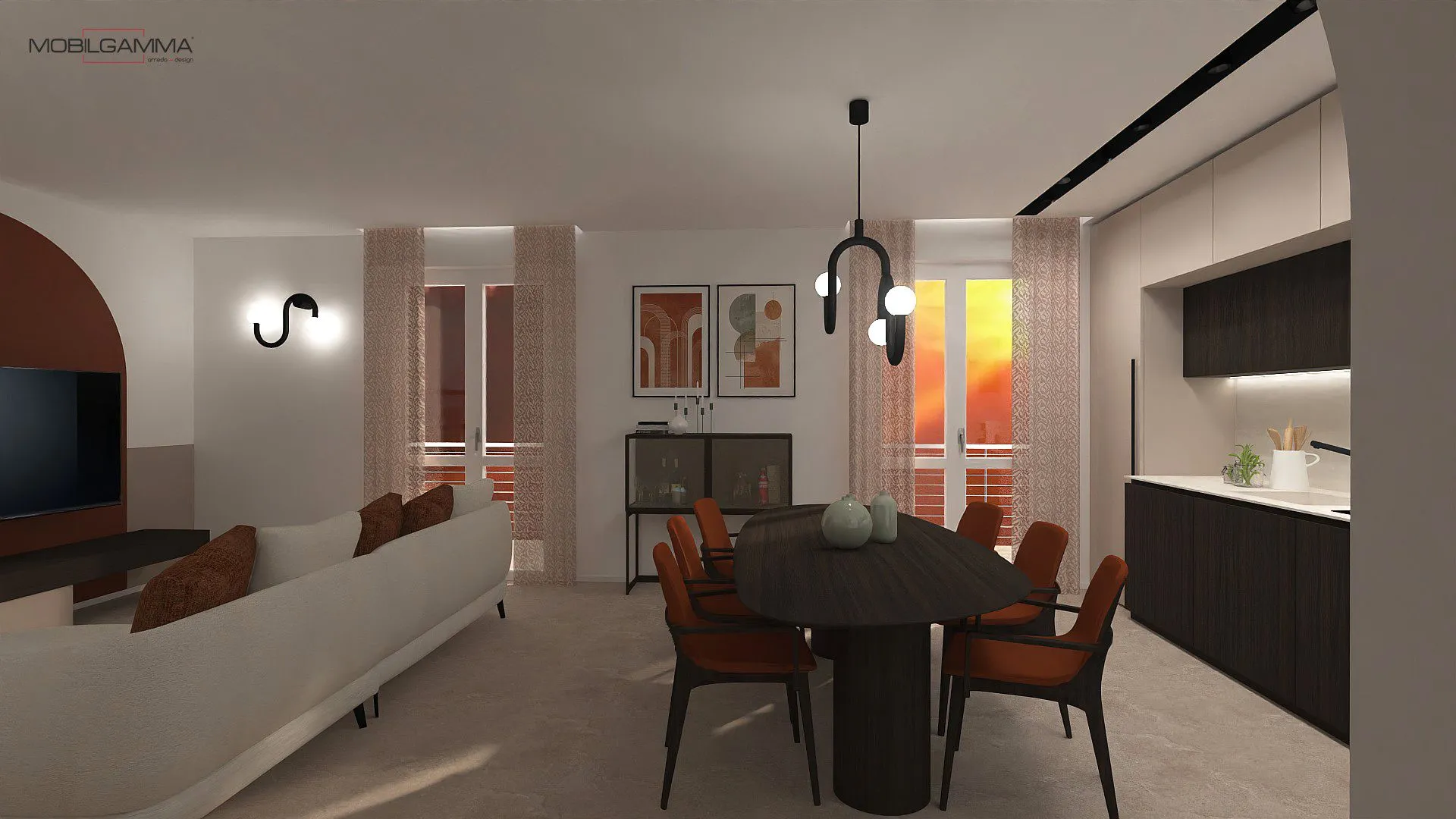 La cucina interpreta il tema con un contrasto materico elegante: basi in essenza scura e pensili in un beige sabbiato molto chiaro, pulito e senza maniglie. L'illuminazione gioca un ruolo chiave con la sospensione a bracci curvi neri e sfere luminose sopra il tavolo e le applique scultoree a parete, che richiamano le geometrie tipiche del design di quegli anni. L'arco color terracotta che incornicia la TV non è solo un dettaglio decorativo, ma un elemento architettonico che ammorbidisce le linee della stanza, creando un angolo accogliente e di carattere.
