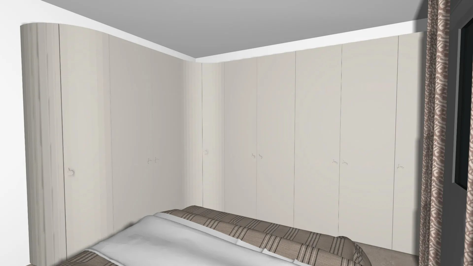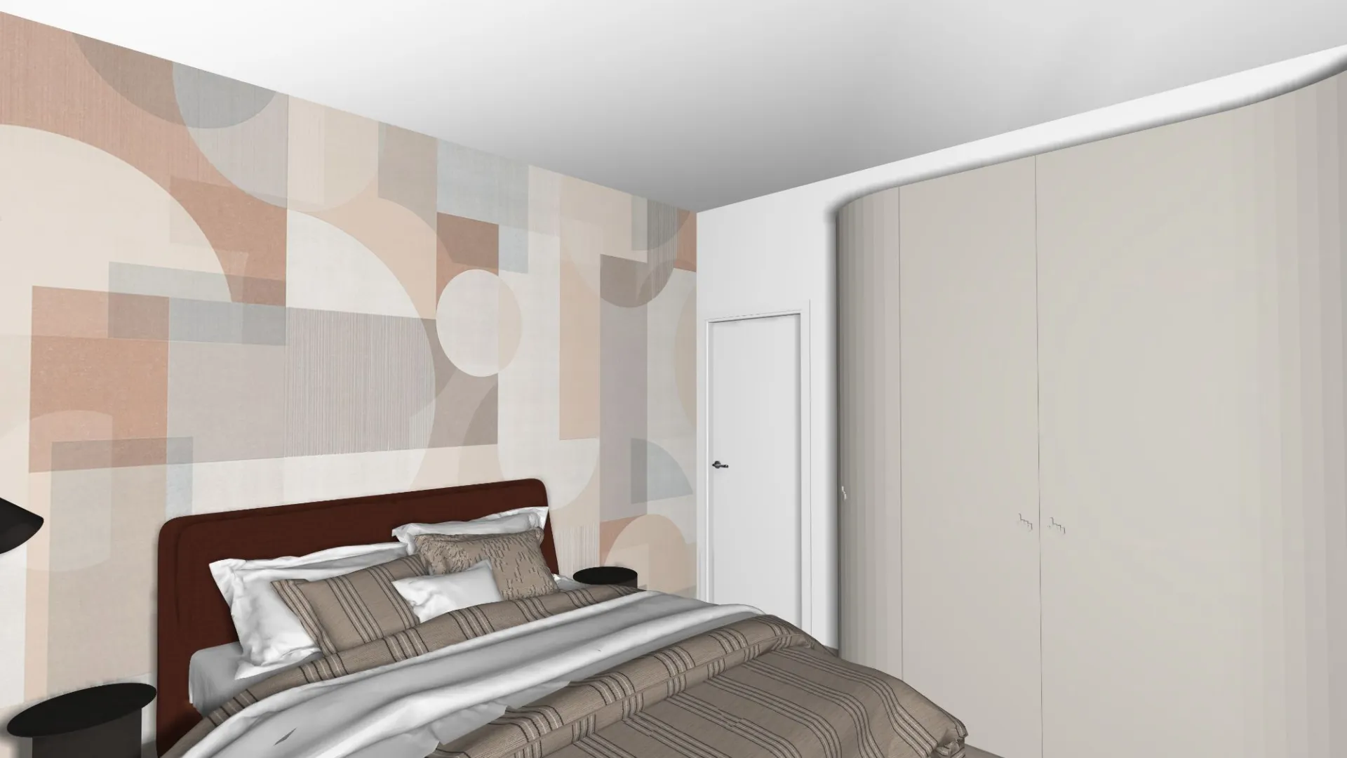 Il vero capolavoro di progettazione su misura è l'armadio angolare. Per ottimizzare lo spazio e mantenere la fluidità stilistica, abbiamo scelto un'armadiatura in finitura laccato opaco chiaro, la cui particolarità risiede nell'elemento terminale curvo. Questa scelta non solo elimina gli spigoli vivi, rendendo il passaggio più agevole, ma riprende le forme morbide e sinuose del tavolo ovale e dell'arco del living, garantendo una coerenza visiva che abbraccia l'intera casa. Anche i tessili, con le righe sottili del copriletto, richiamano con discrezione il rigore geometrico del decennio.