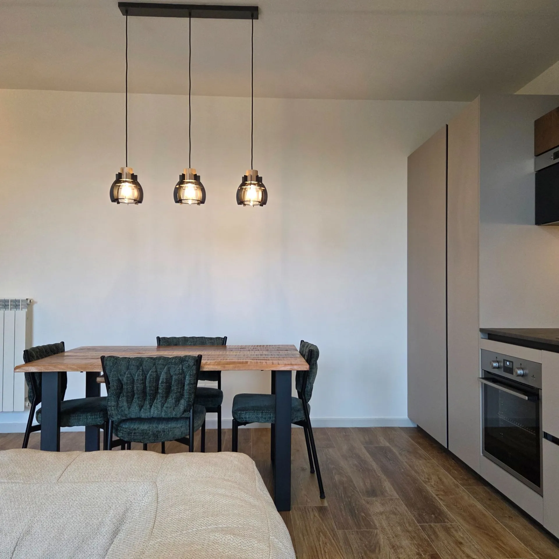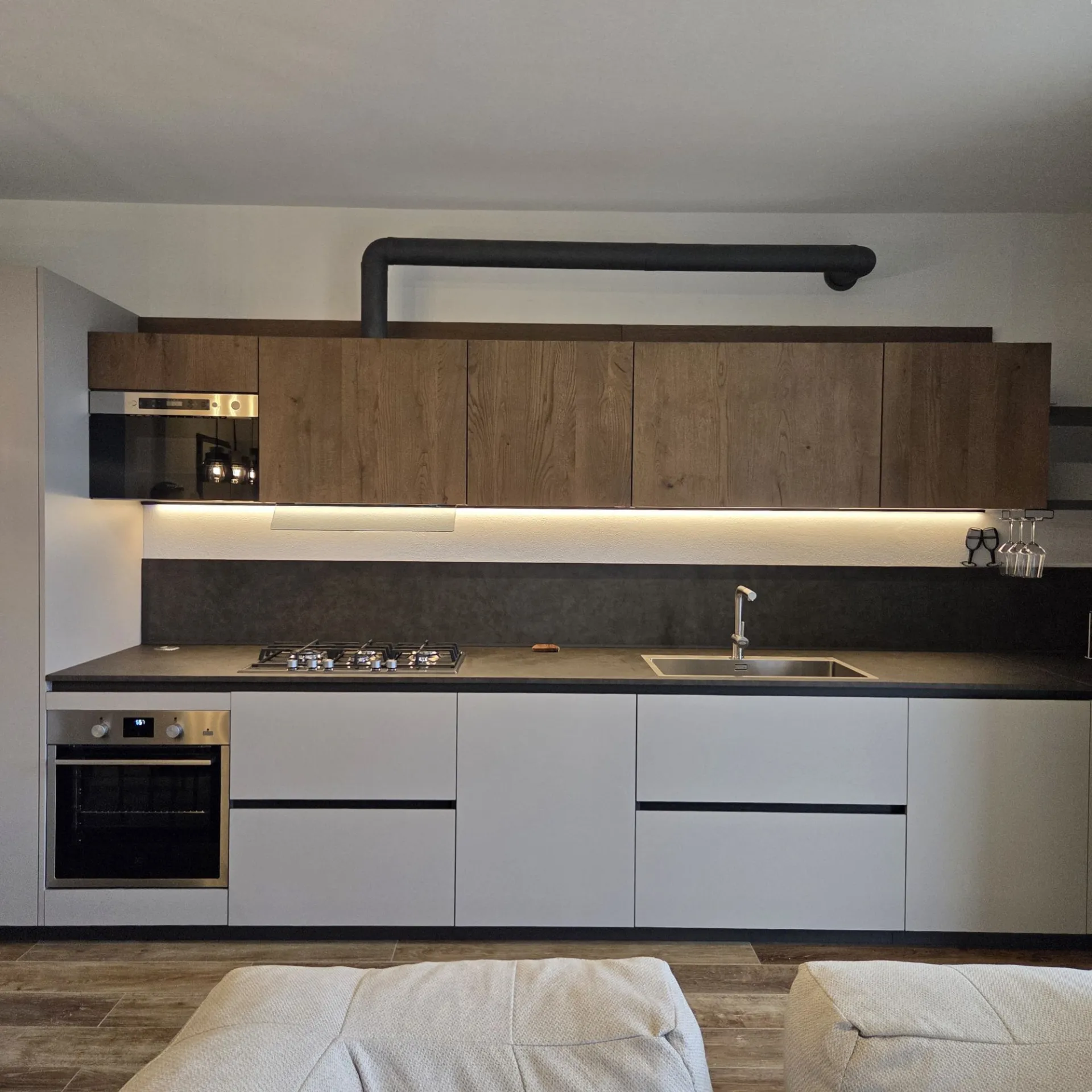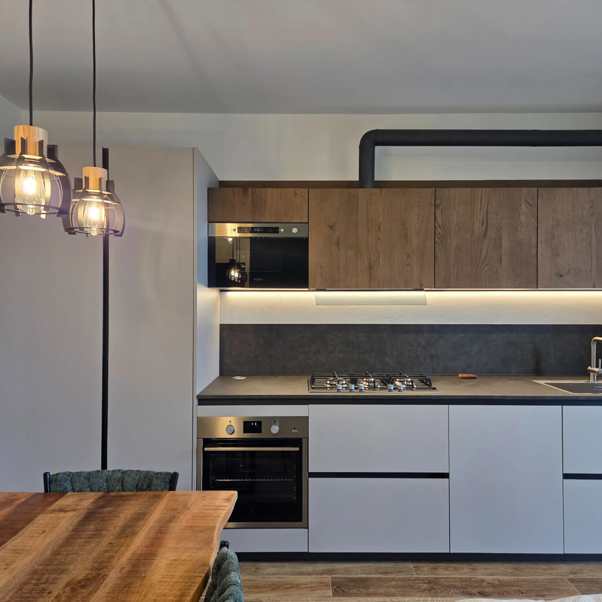 L’illuminazione su misura alterna corpi lineari e sospensioni decorative, progettati per valorizzare le aree funzionali e creare un’atmosfera calda e accogliente durante ogni momento della giornata.