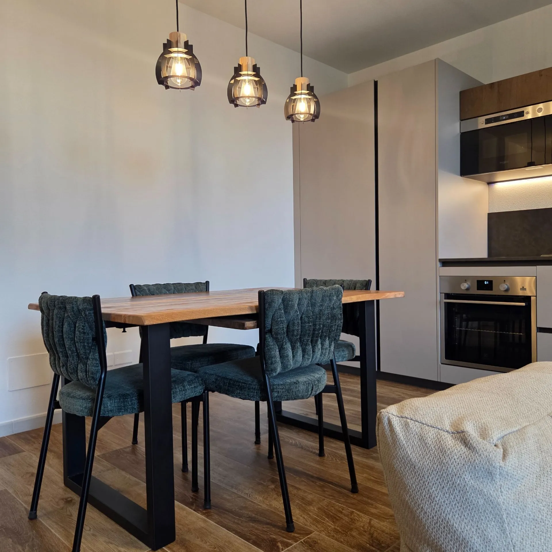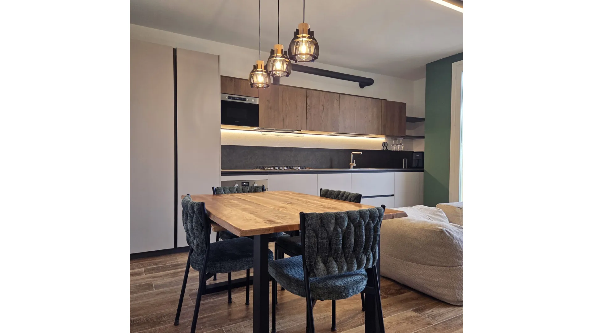 Le essenze naturali del legno, protagoniste del pavimento e del piano del tavolo, dialogano con le tonalità neutre e sofisticate della cucina e con il verde della parete, che aggiunge un tocco di personalità e benessere visivo.