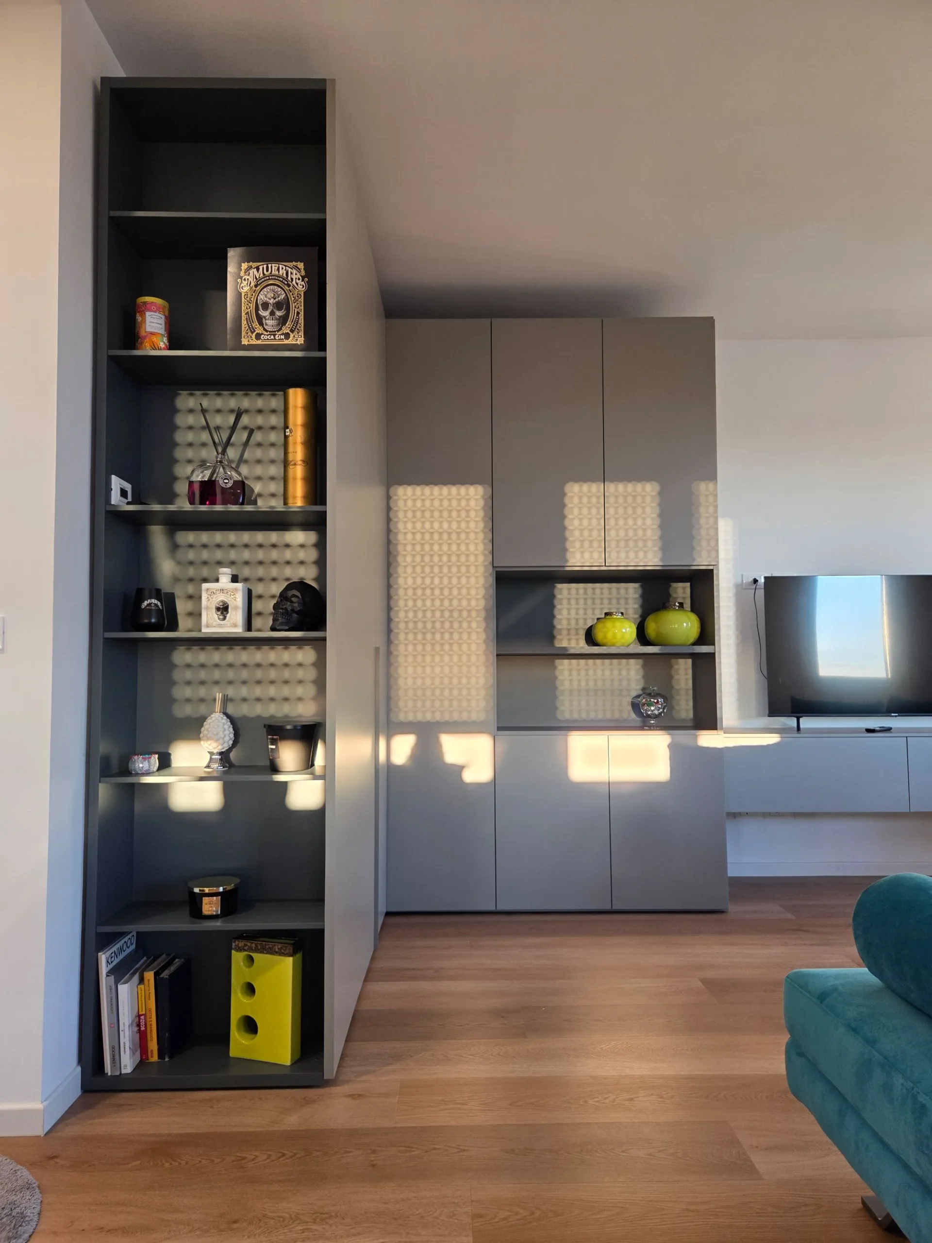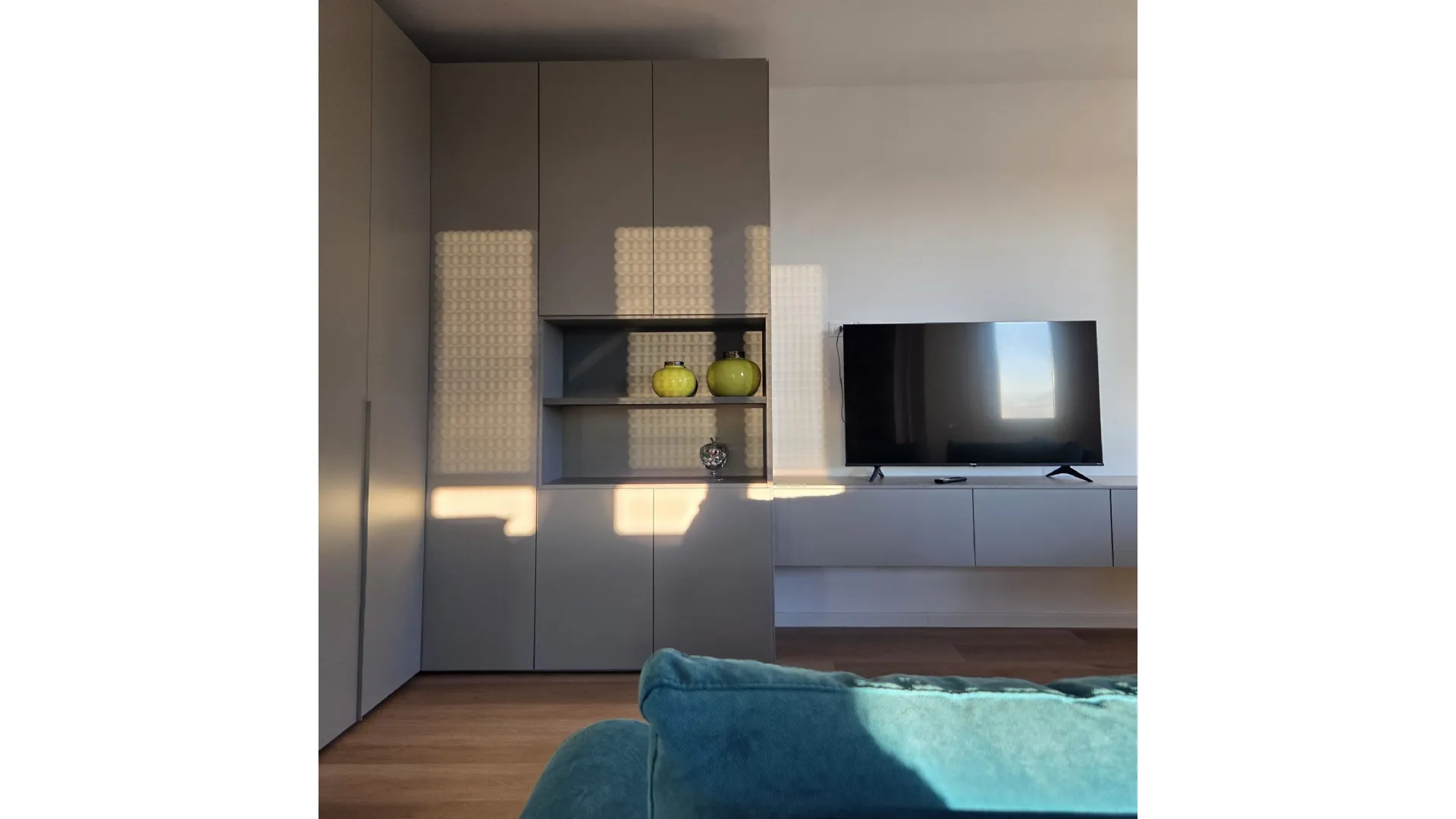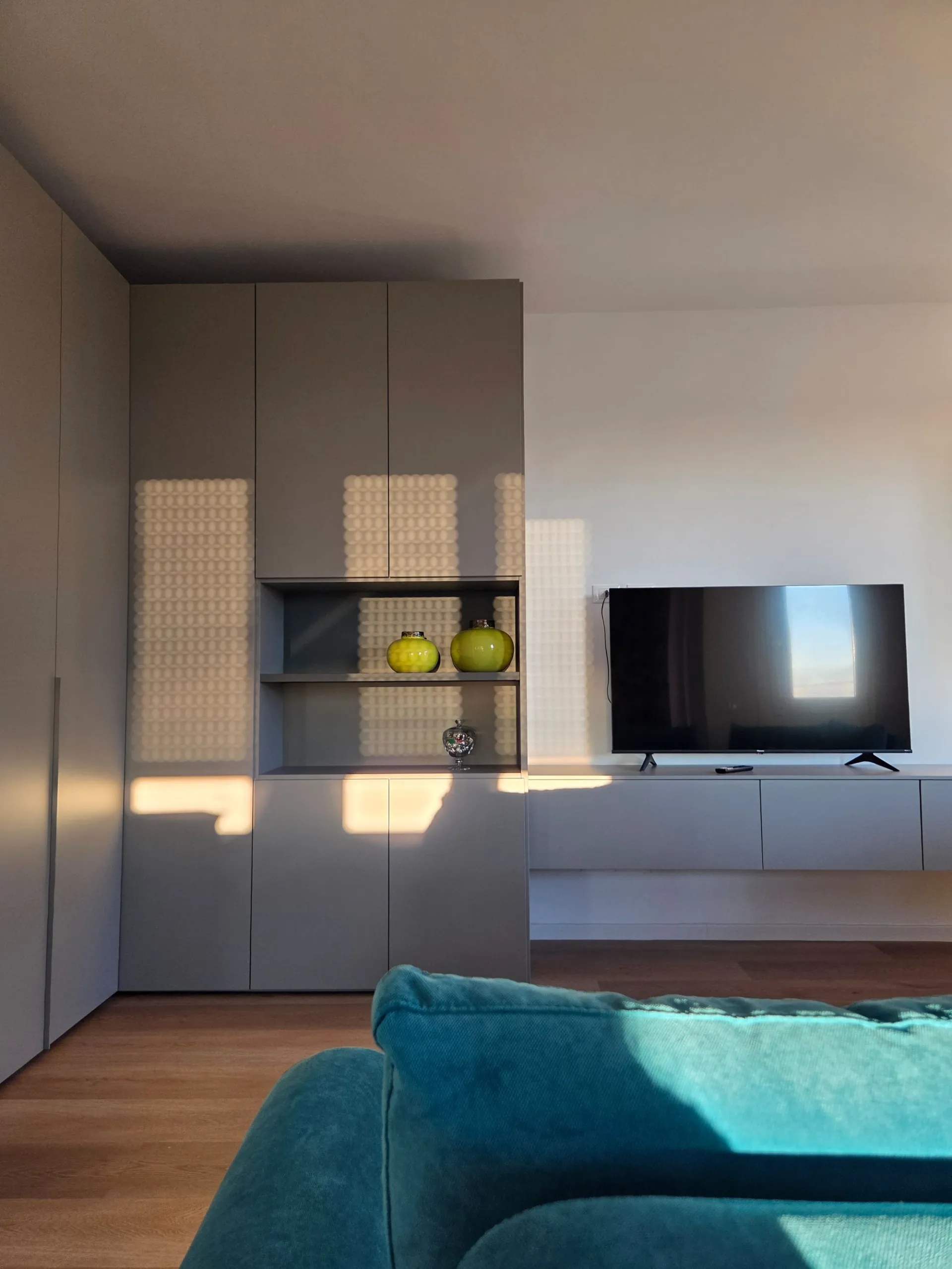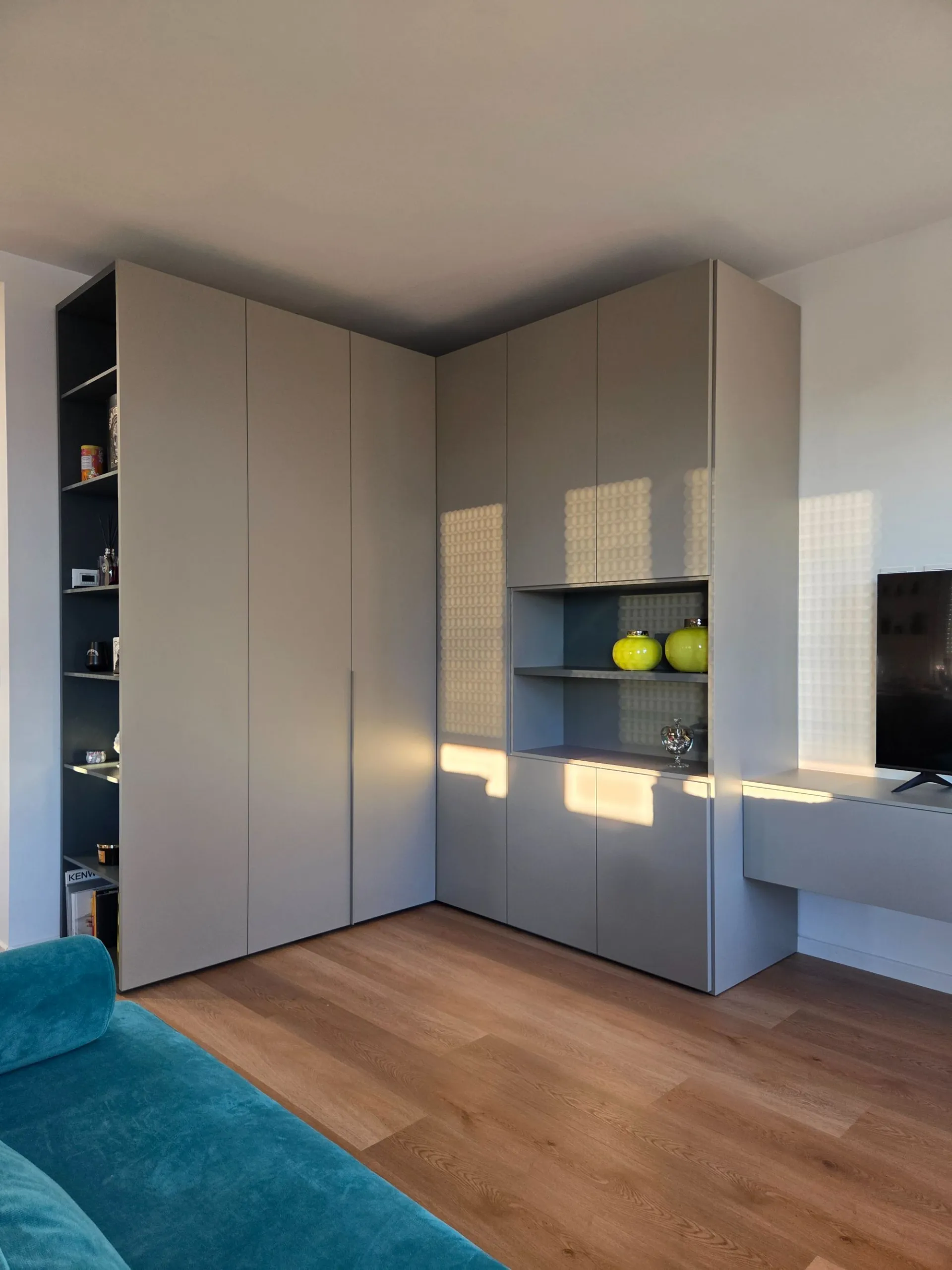 La scelta di un armadio ad angolo con apertura totale ha consentito di ottenere un contenimento eccezionale — molto più di quanto comunemente si riesce a immaginare in un soggiorno: un mobile versatile, discreto e capiente, perfetto per custodire tutto l’essenziale senza rinunciare a estetica e pulizia visiva.