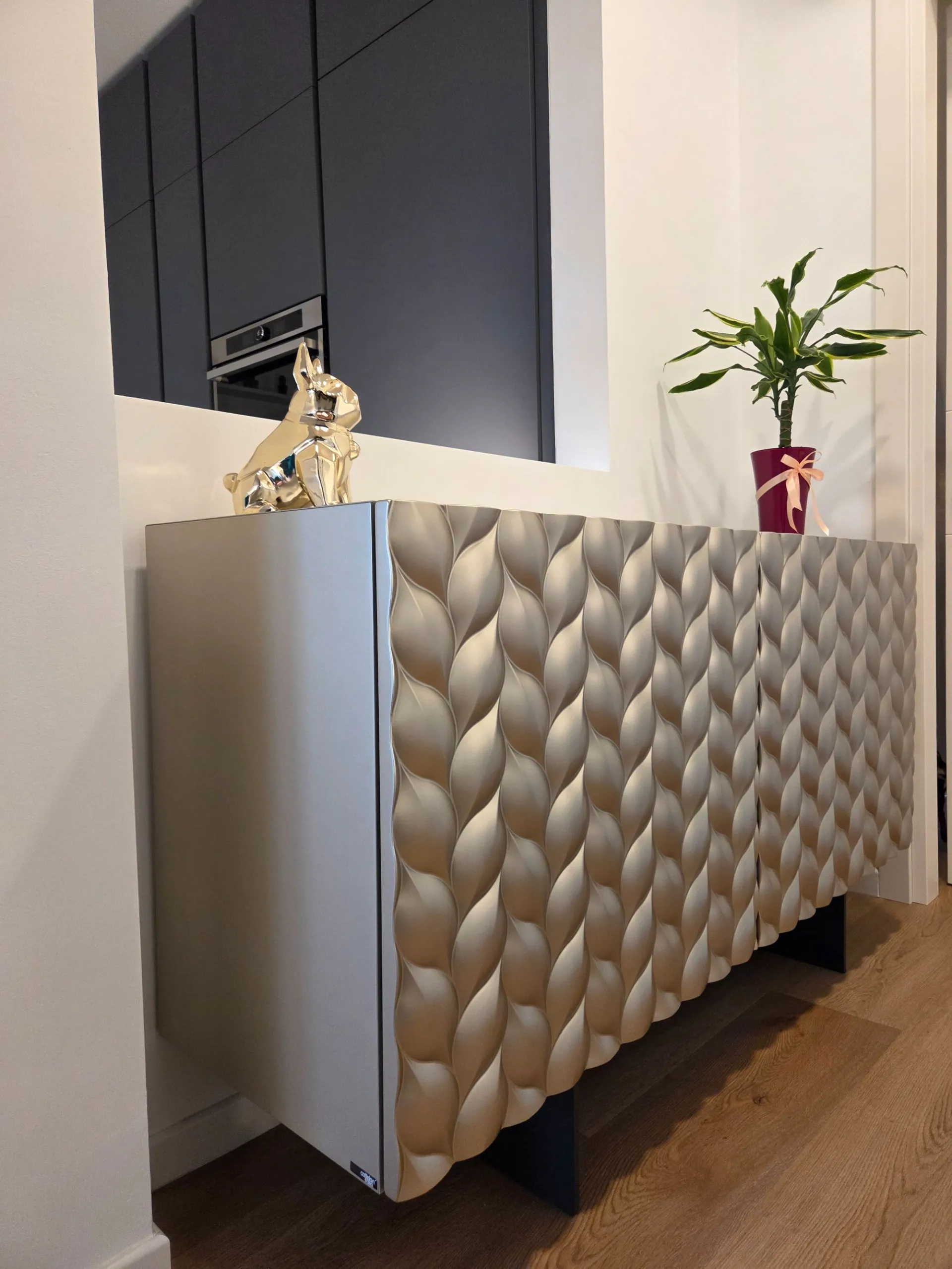 La madia, modello Lavander di Cattelan Italia, con la sua lavorazione distintiva e le sue curve eleganti, diventa elemento protagonista dell’ingresso: un perfetto equilibrio tra design contemporaneo e funzionalità domestica.